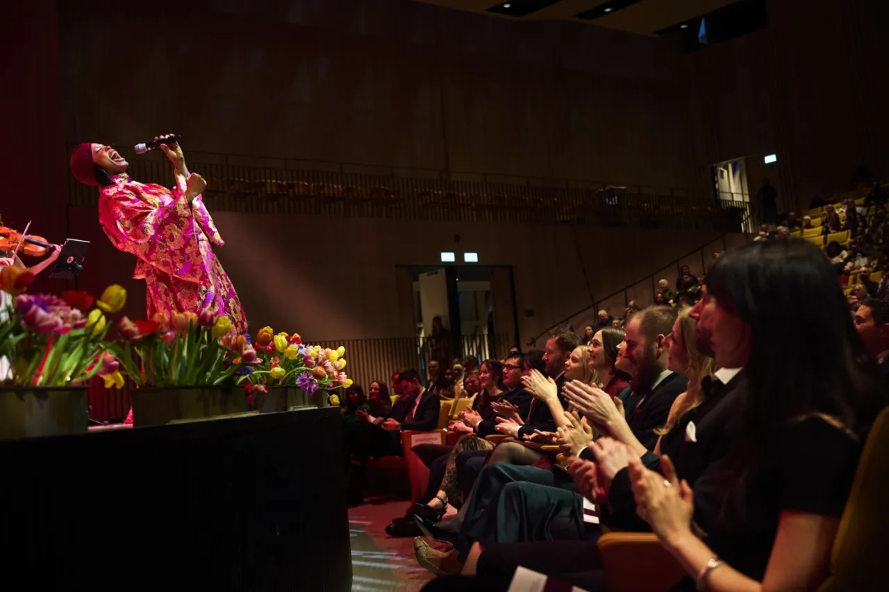 Efter talen fylldes Erling Persson-salen med musik och energi. Kiralina Salandy och Rosa Kvartetten framförde låtarna Think* och senare Ain’t no mountain high enough**, som båda fick publiken att resa sig upp från sina platser och klappa med.
